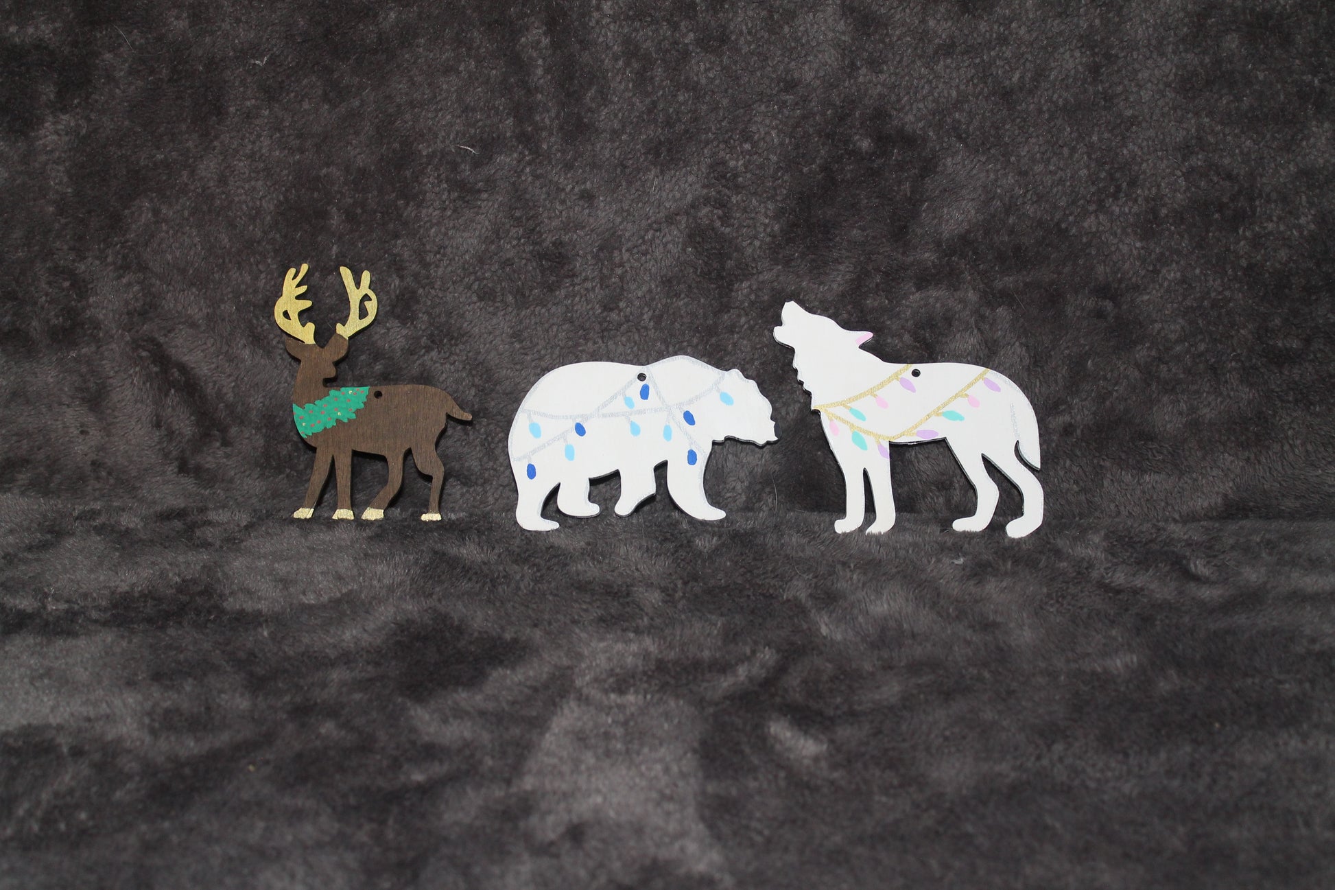 Wolves, foxes, and bears, Oh My! Each of these sets has 6 hand painted wooden ornaments in three themes. Traditional Christmas ( red, green and gold), Blue Blizzard (blue, white and silver) and Pastel Pop (pastel pink, purple, and blue with silver and gold). Each set contains a wolf, fox, bear, moose, deer, and a decorated tree. Grab your favorite set today as once they sell out they will not be recreated or restocked.